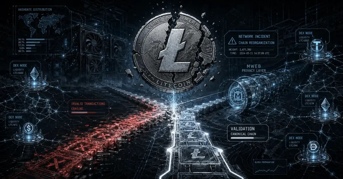 Litecoin kembali normal setelah sebuah peristiwa jaringan langka memaksa reorganisasi rantai 13 blok dan menimbulkan pertanyaan baru tentang alat privasi, node penambangan, dan swap lintas rantai. Insiden ini dimulai pada 25 April, ketika Litecoin mengumumkan bahwa sebuah bug zero‑day menyebabkan serangan penolakan layanan (DoS) yang mengganggu pool penambangan utama. Bug tersebut melibatkan MWEB, singkatan dari MimbleWimble Extension Blocks, lapisan privasi Litecoin yang memungkinkan pengguna memindahkan koin ke bagian jaringan yang lebih privat.